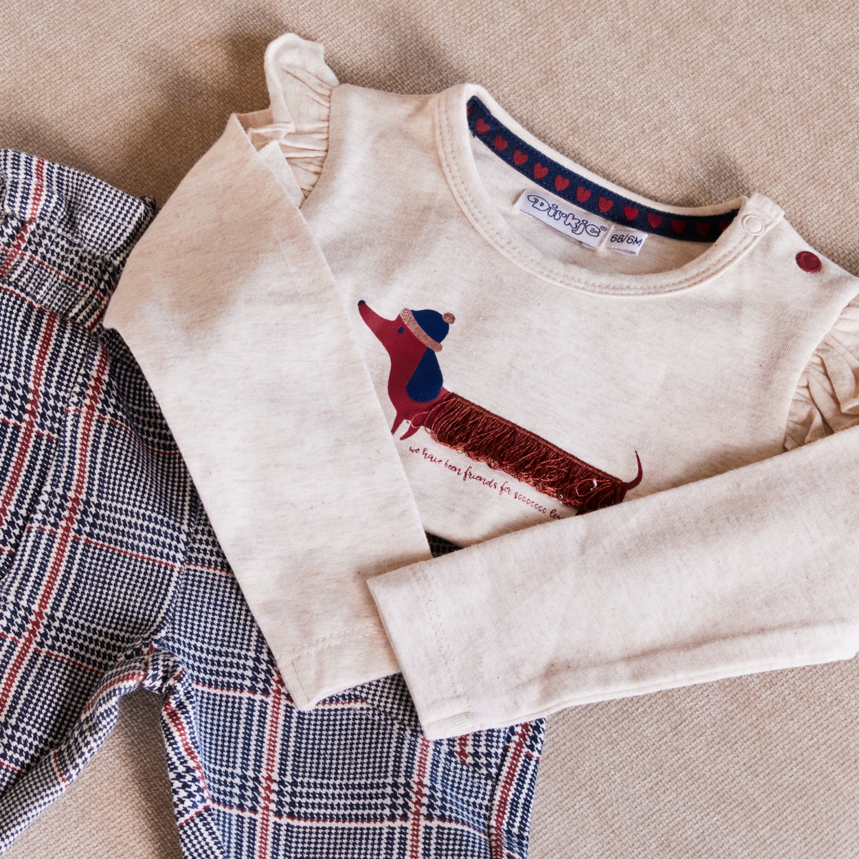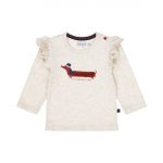 • Das Mädchen-Langarmshirt hat Rüschen an den Schultern und einen süßen Dackel auf der Vorderseite.