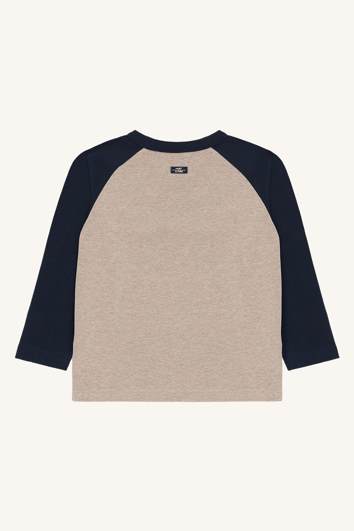 - Die dunkelblauen Ärmel bilden einen schönen Kontrast zum beige-melierten Grundton des Shirts
