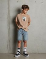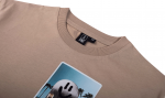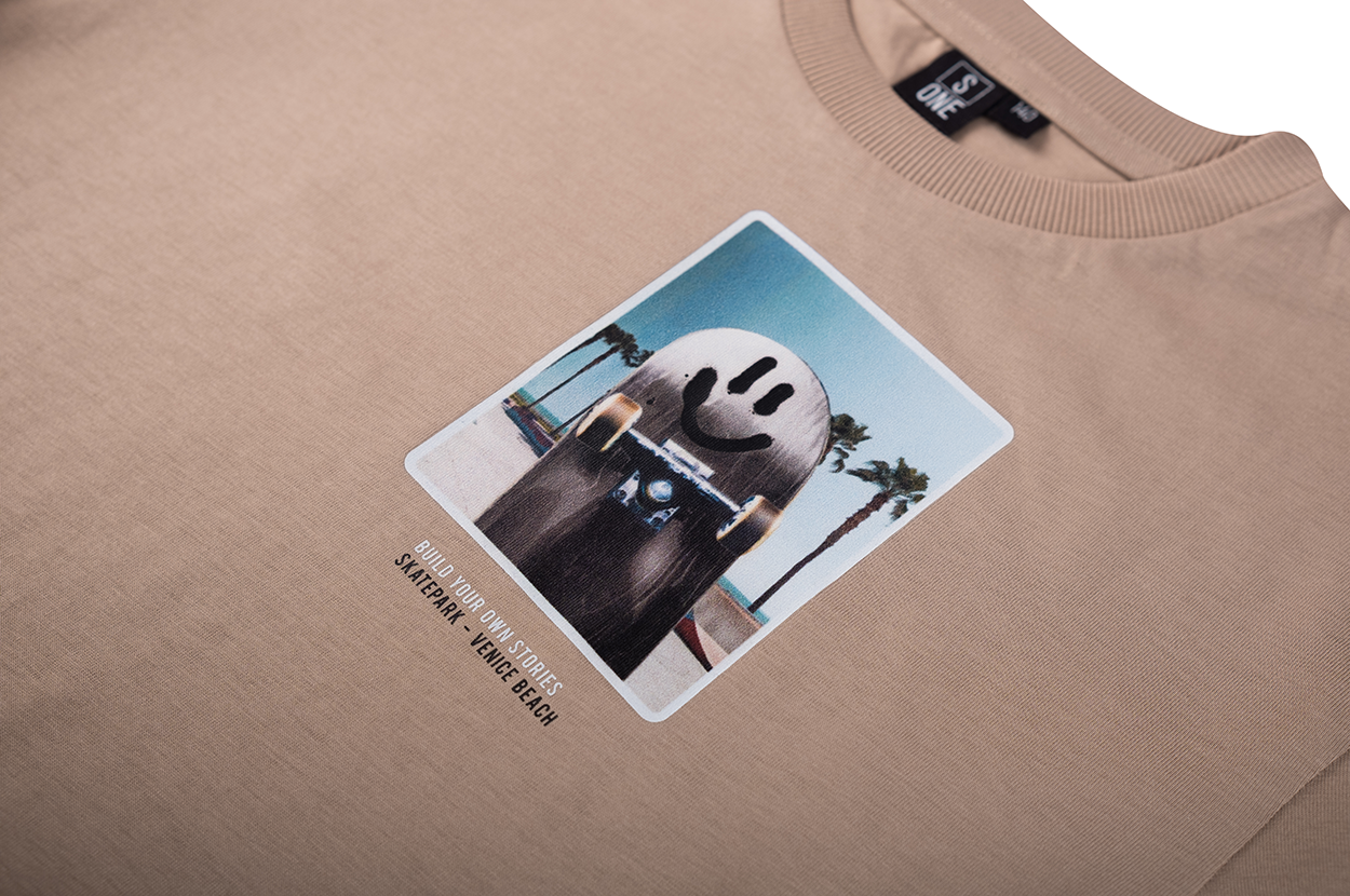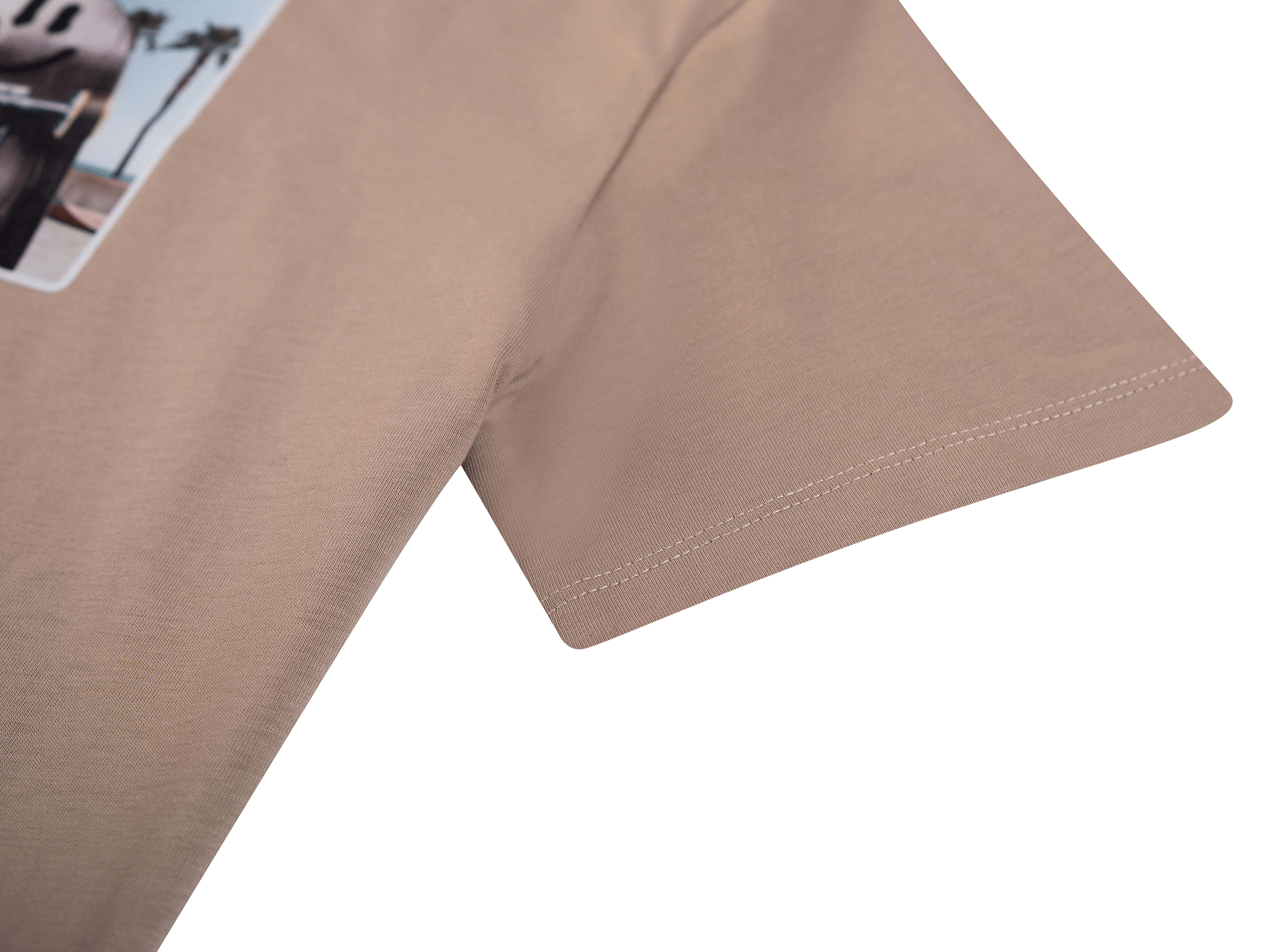 - Dieses sandfarbene T-Shirt hat einen lockeren Look, der durch den Fotodruck auf der Brust hervorgehoben wird.