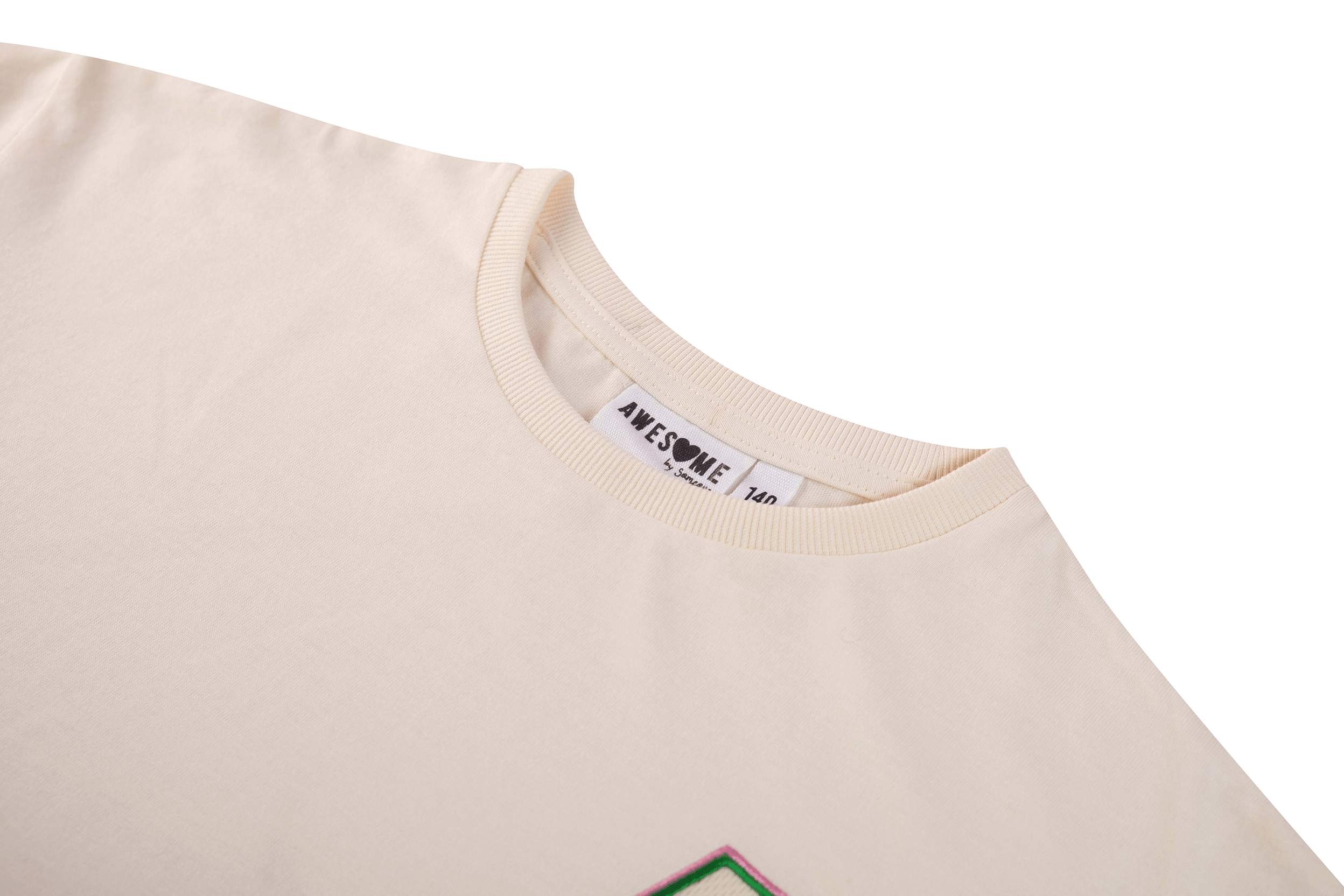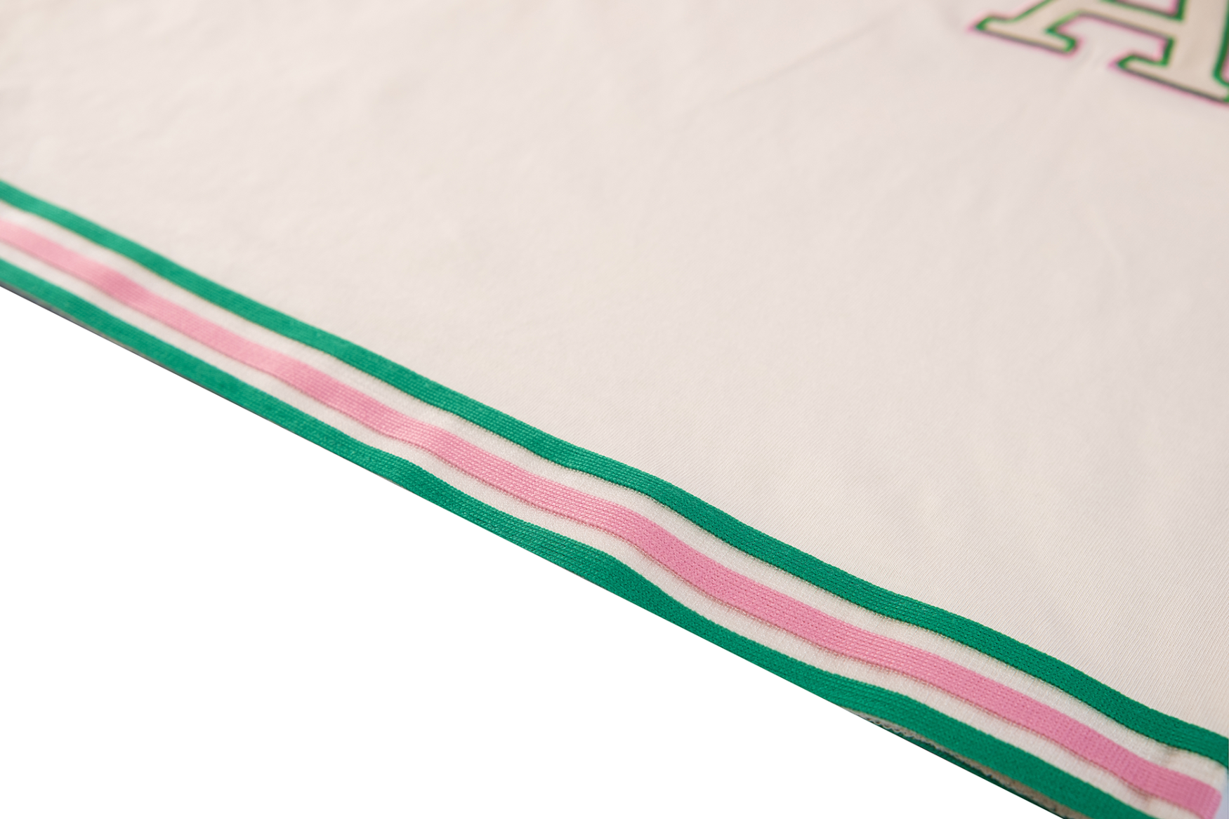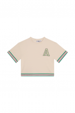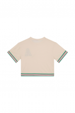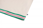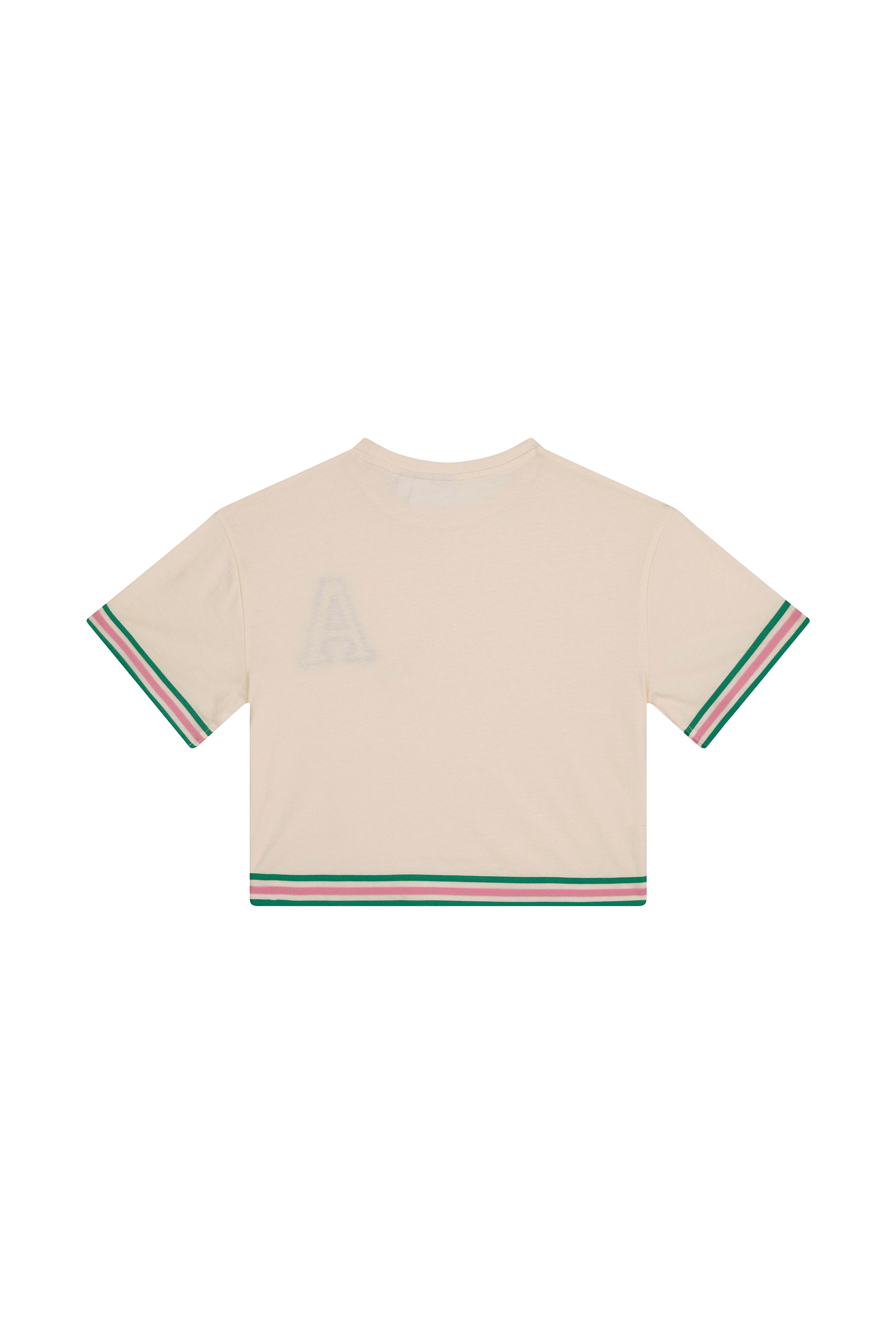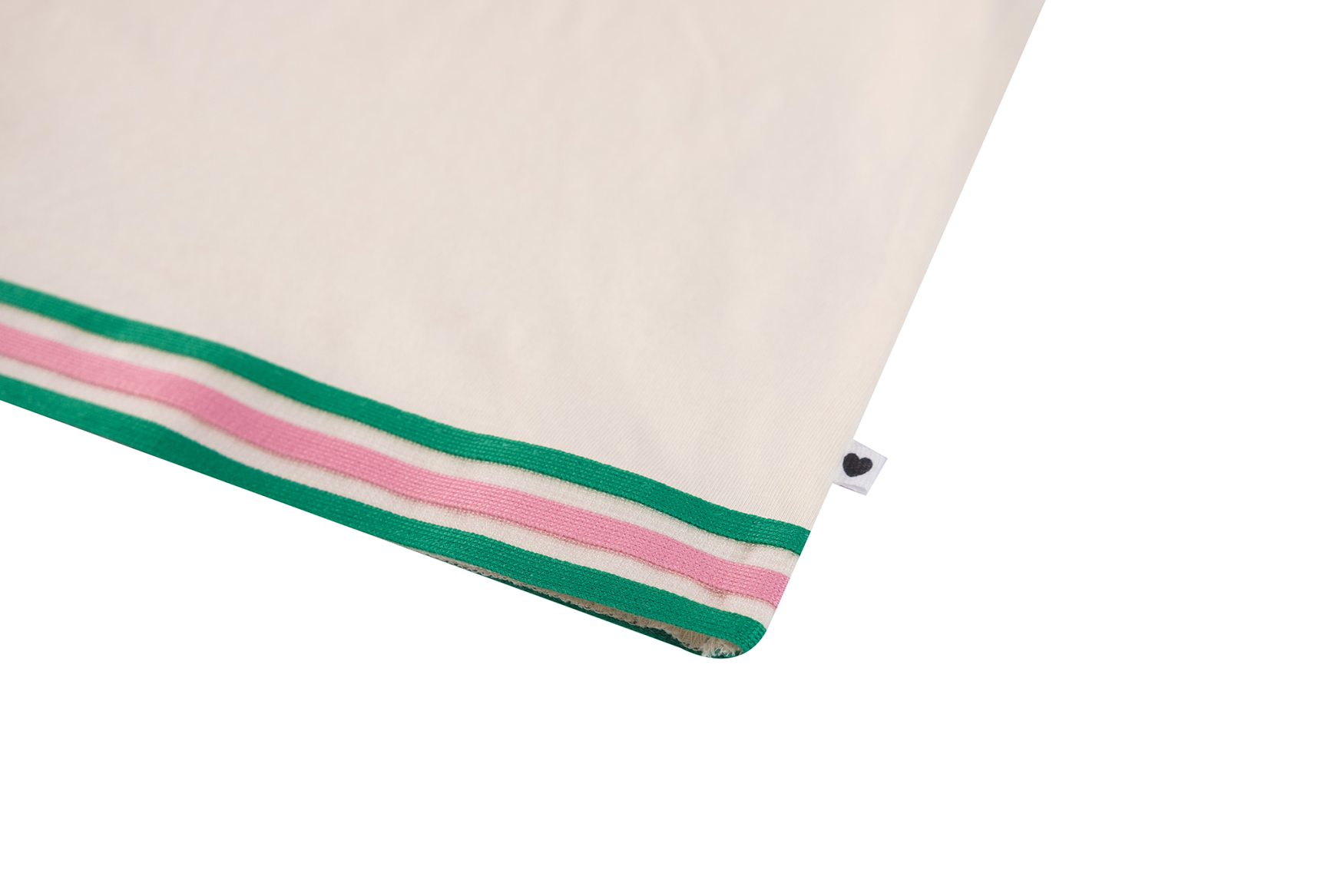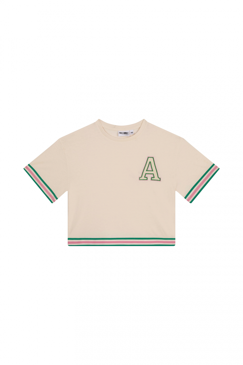 - Beige, kurzes T-Shirt mit grünen und rosa Streifen an Ärmeln und Saum.