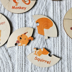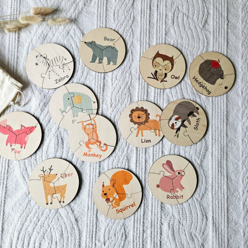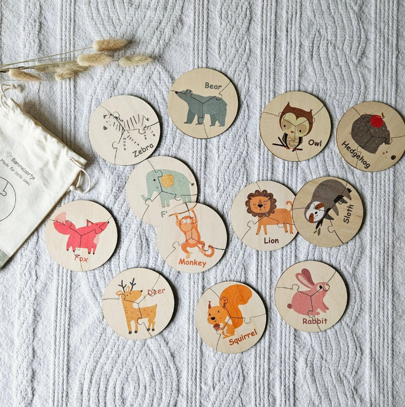 Set mit 12 runden Holzpuzzles mit Tieren. Diese Puzzles werden in einer robusten Aufbewahrungstasche aus Segeltuch geliefert. Die runden Holzpuzzles sind zur Förderung der Motorik gedacht und bestehen aus 3 Teilen. Um den Schwierigkeitsgrad zu erhöhen, können natürlich auch mehrere Puzzleteile zusammengelegt werden.