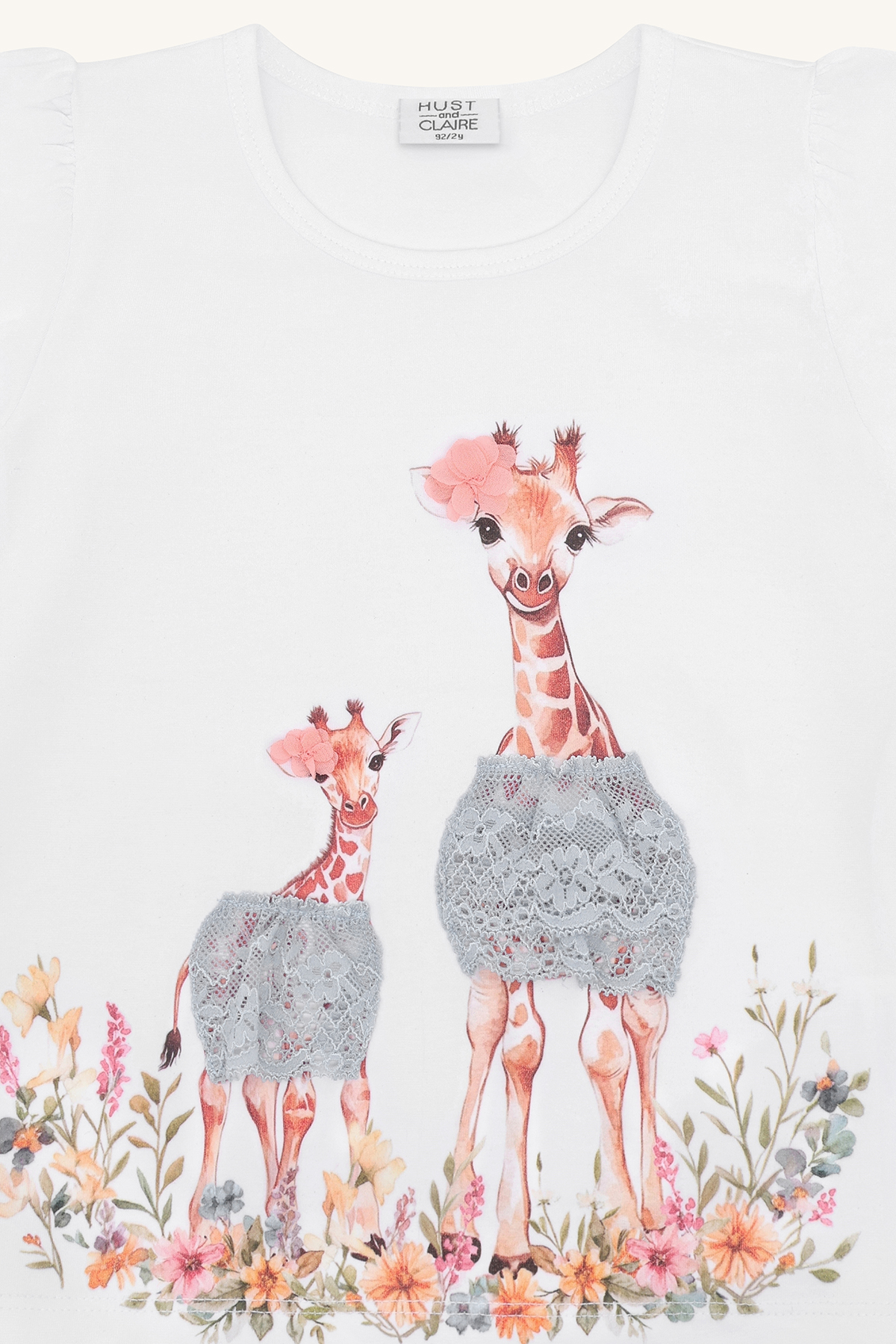 Das Shirt HCAlma Giraffes von Hust & Claire begeistert mit einem besonders charmanten und detailverliebten Design. Die niedlichen Giraffen-Motive, kombiniert mit zarten floralen Elementen und feinen 3D-Spitzen-Details, machen dieses T-Shirt zu einem echten Hingucker.