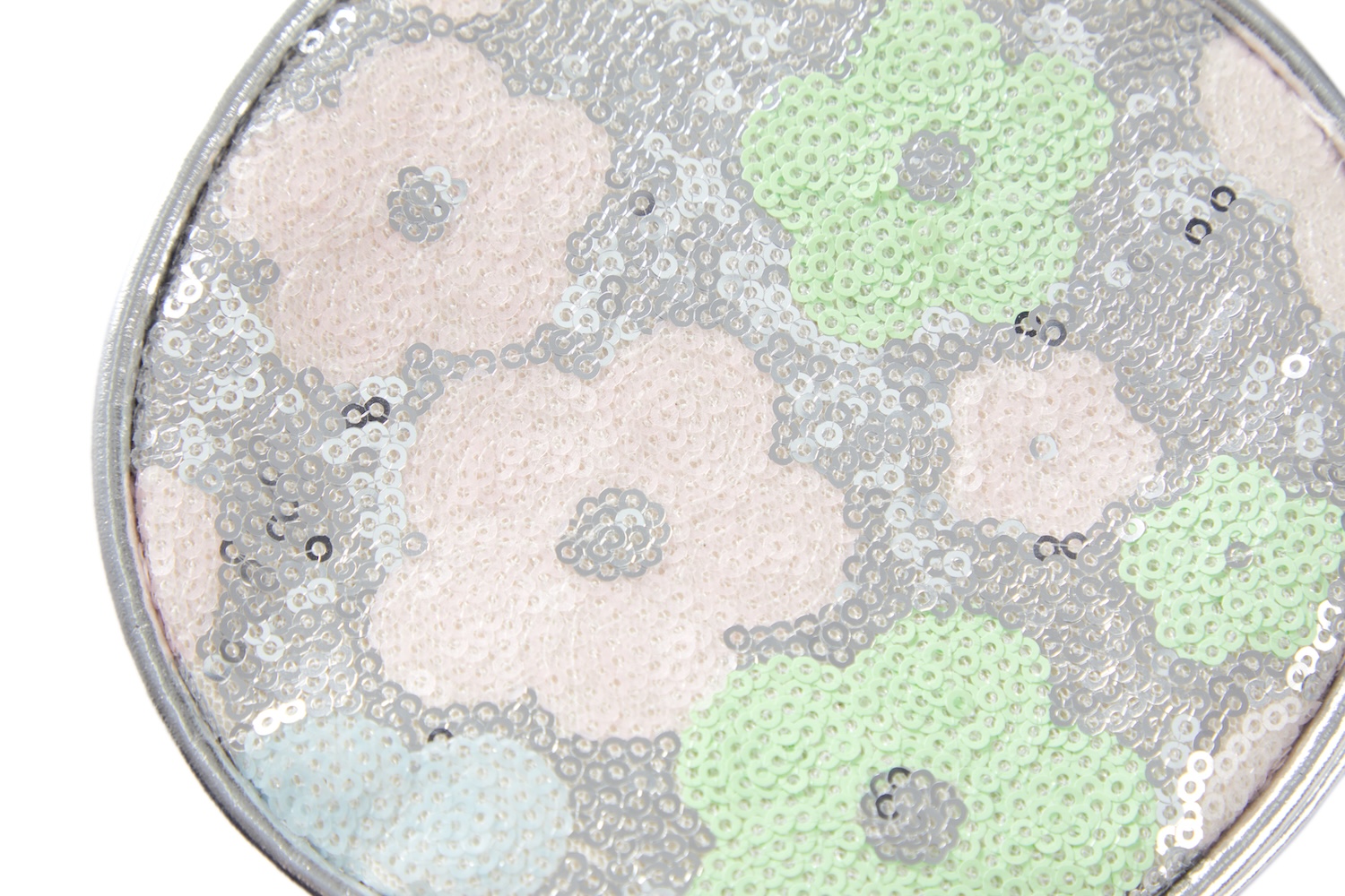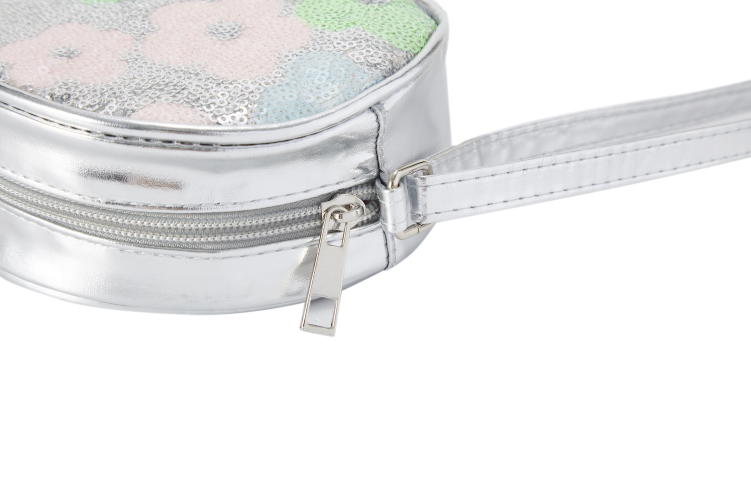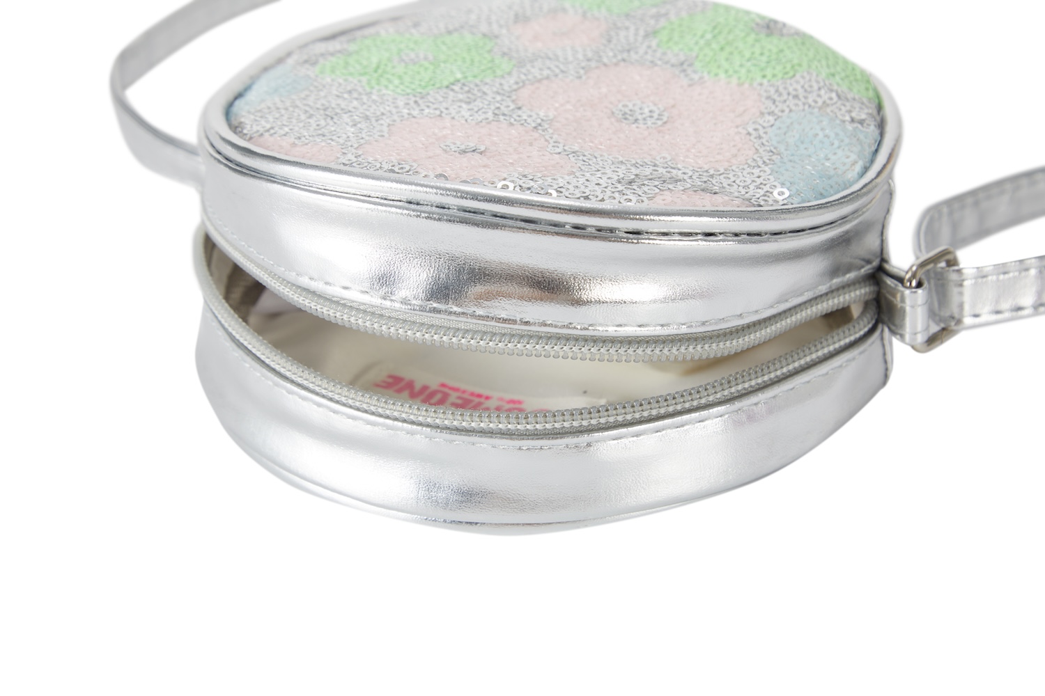 - Diese runde Handtasche sticht durch ihr ihre runde Form und das spielerische Blumen Design auf der Vorderseite hervor.